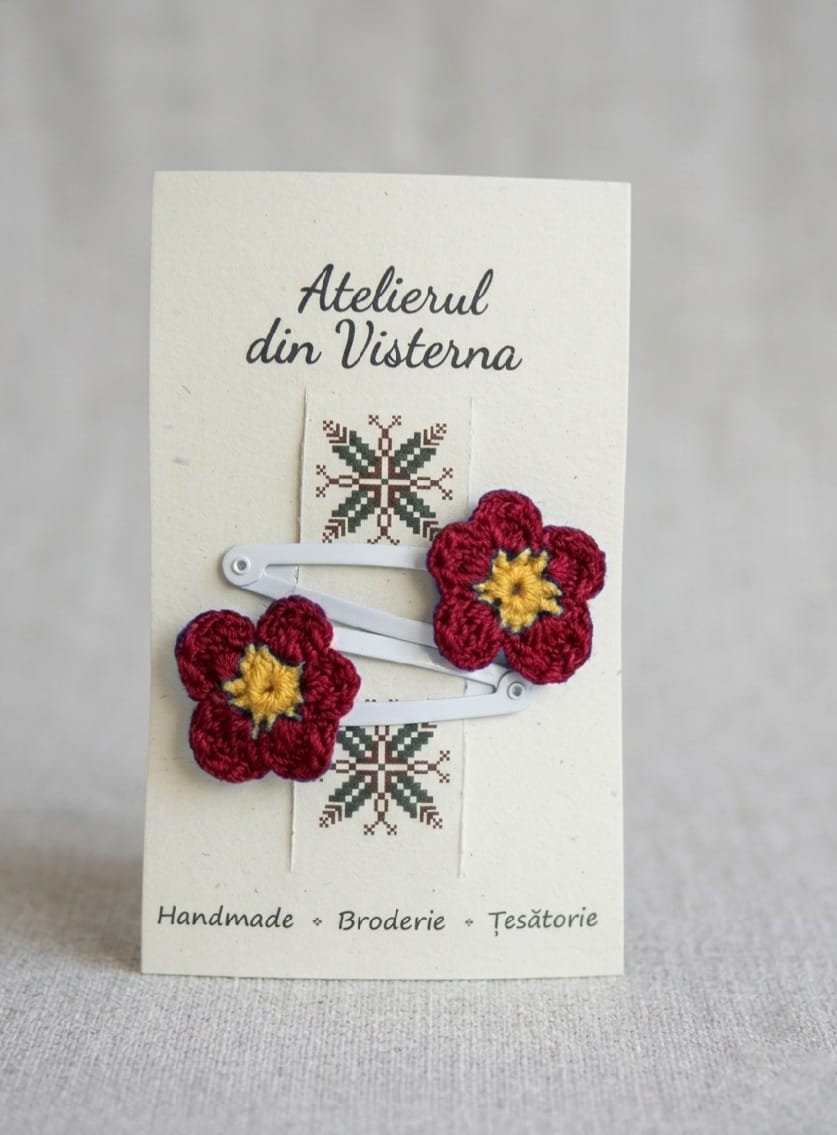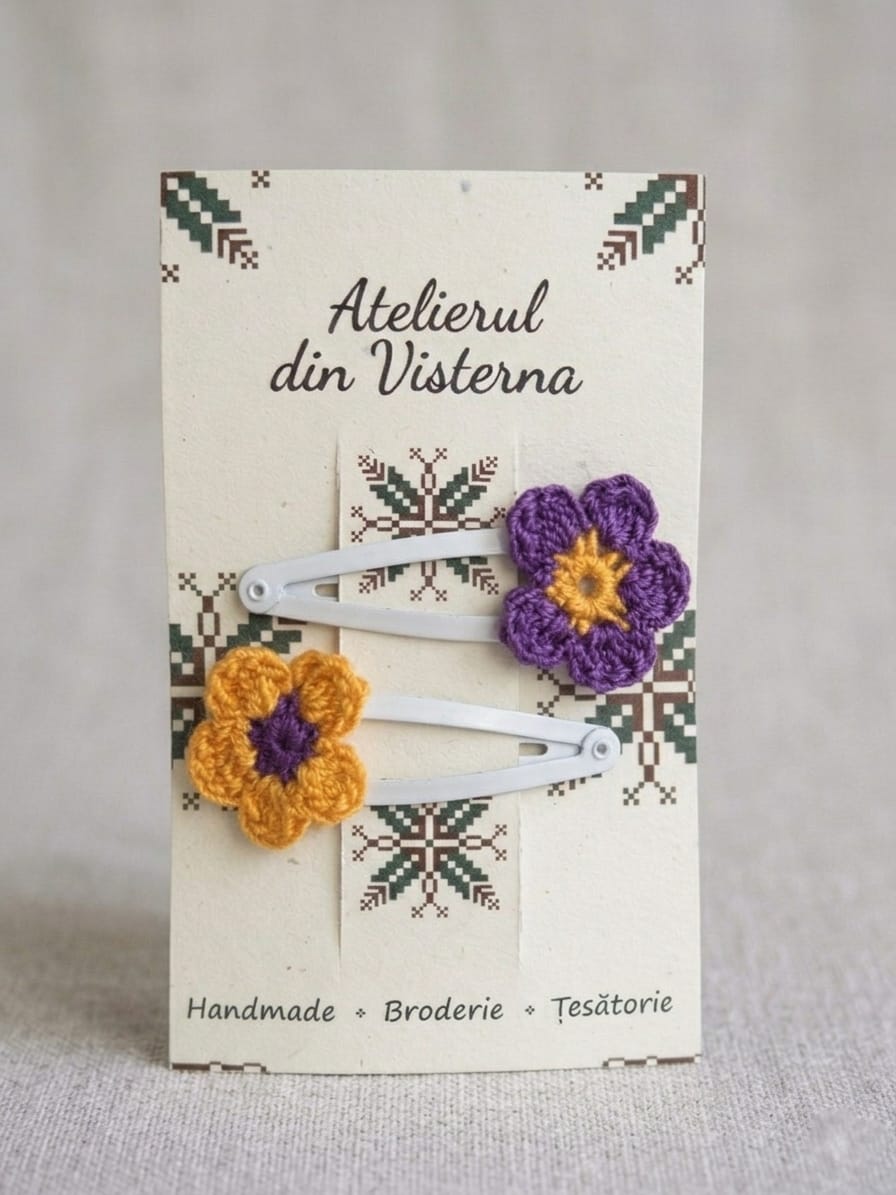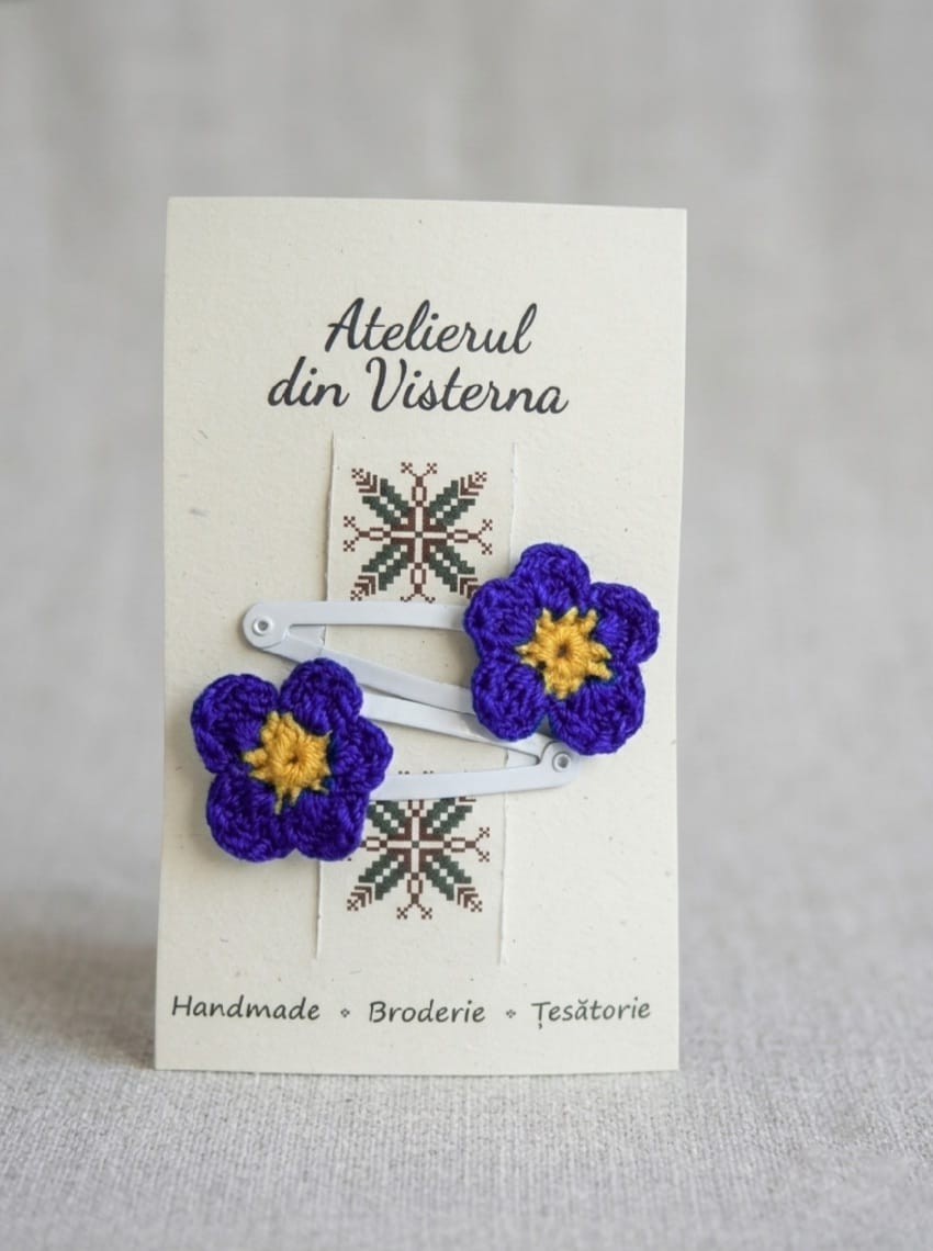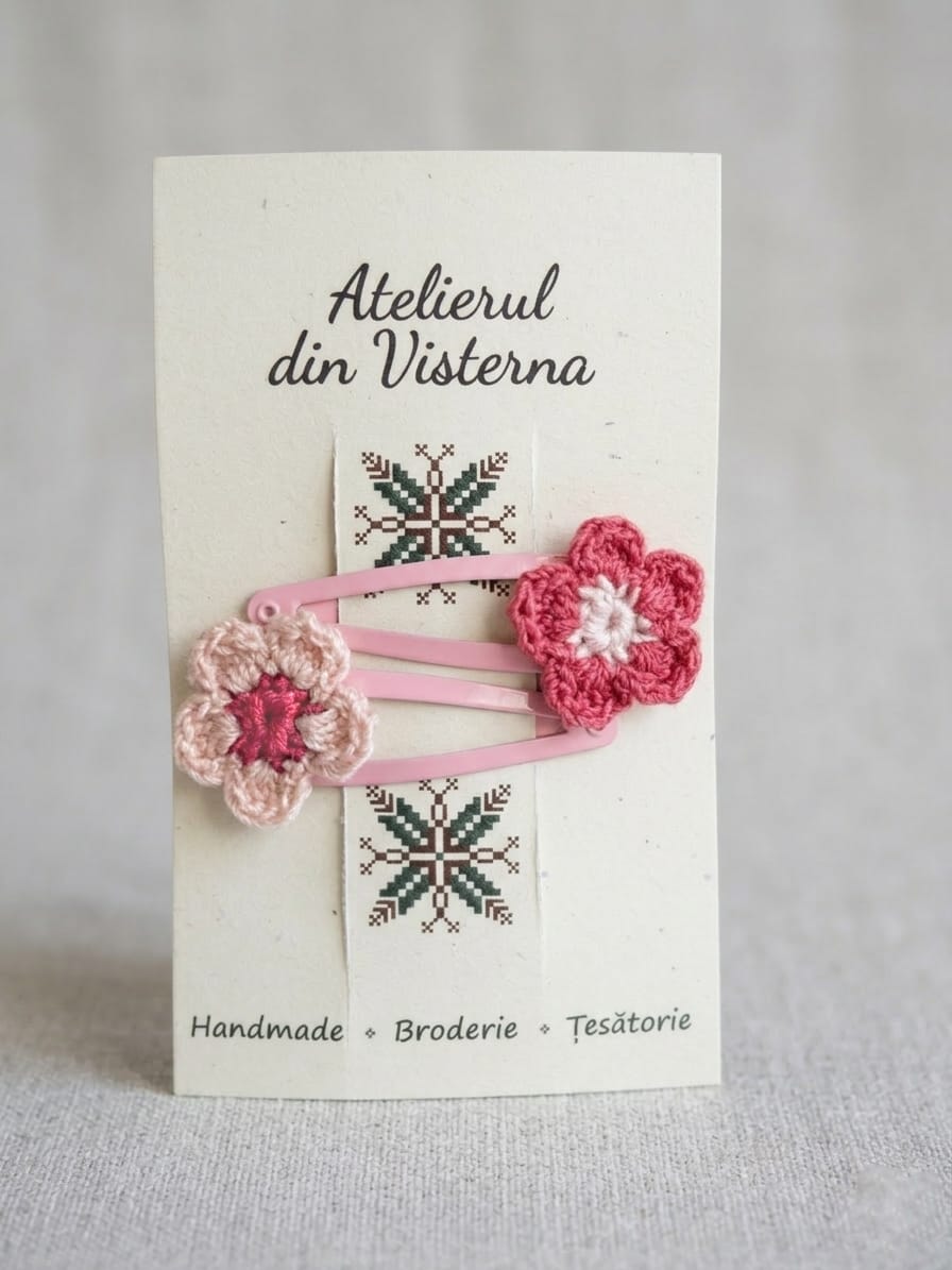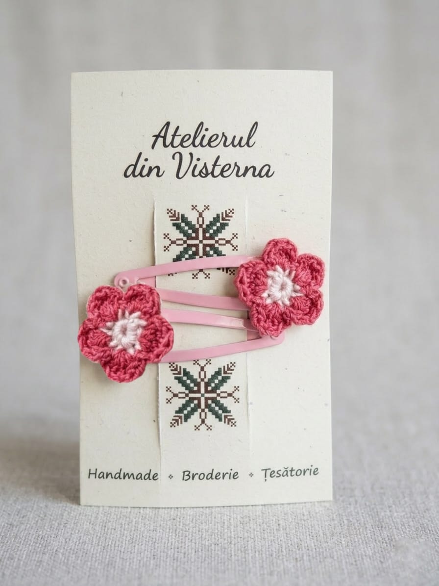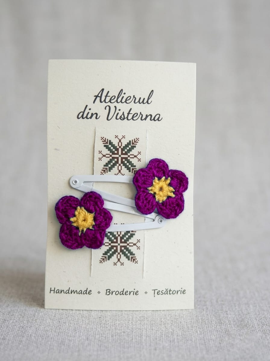 • Realizată handmade: Fiecare agrafă este realizată manual cu atenție, prin croșetare și lipire, oferind unicitate și calitate superioară.