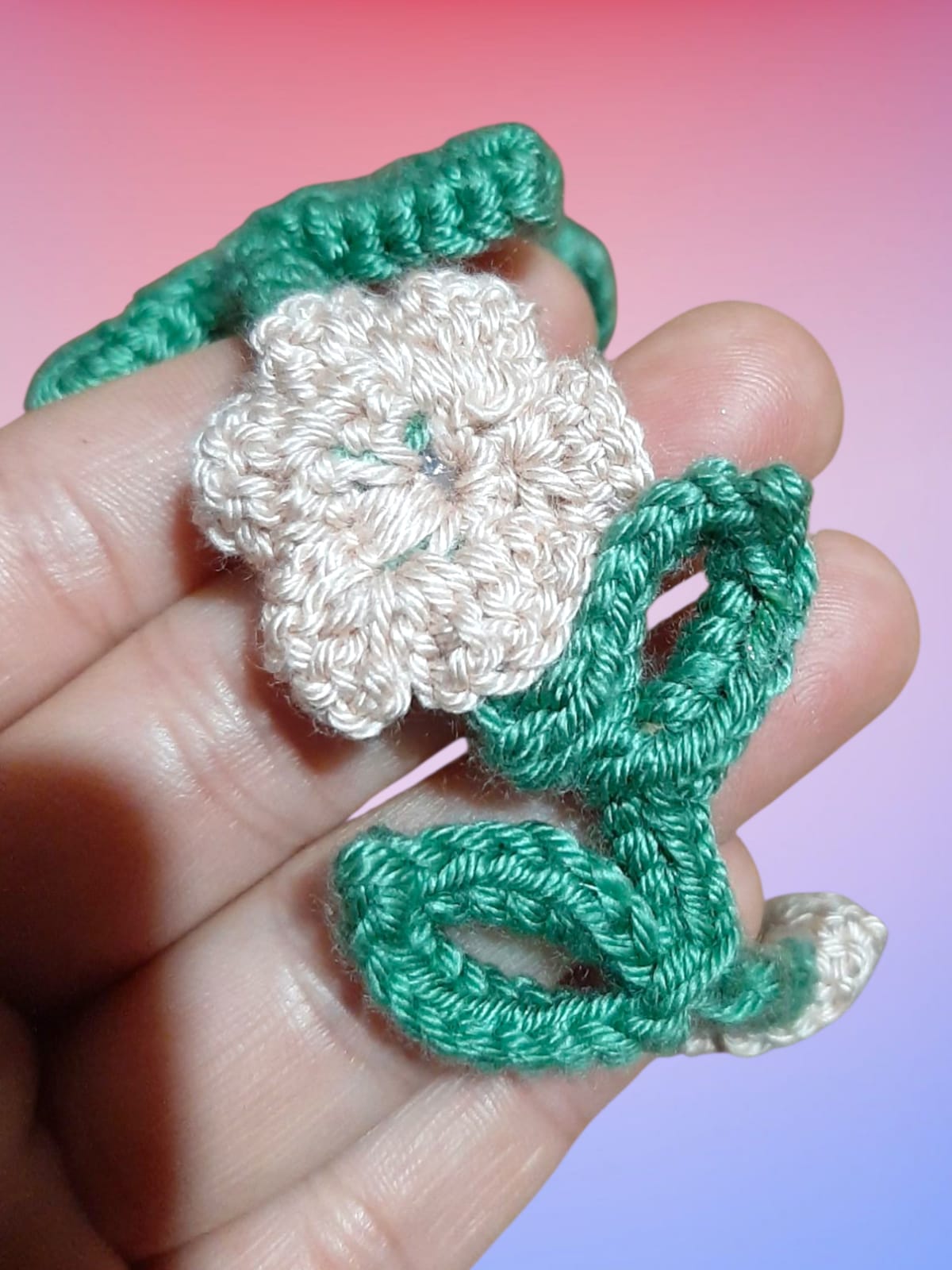 Brățară, cu bază metalică și decor floral croșetat manual – un accesoriu autentic și elegant, ideal pentru a adăuga originalitate oricărei ținute.