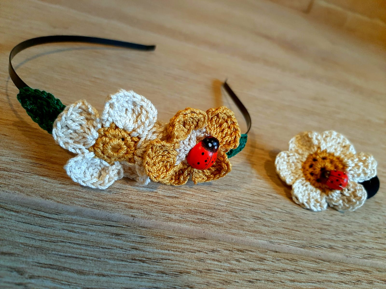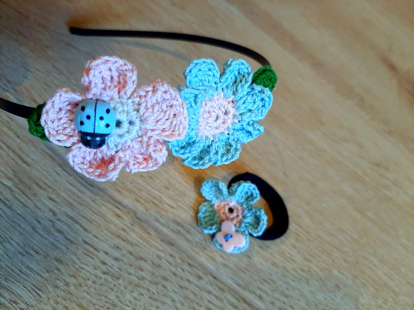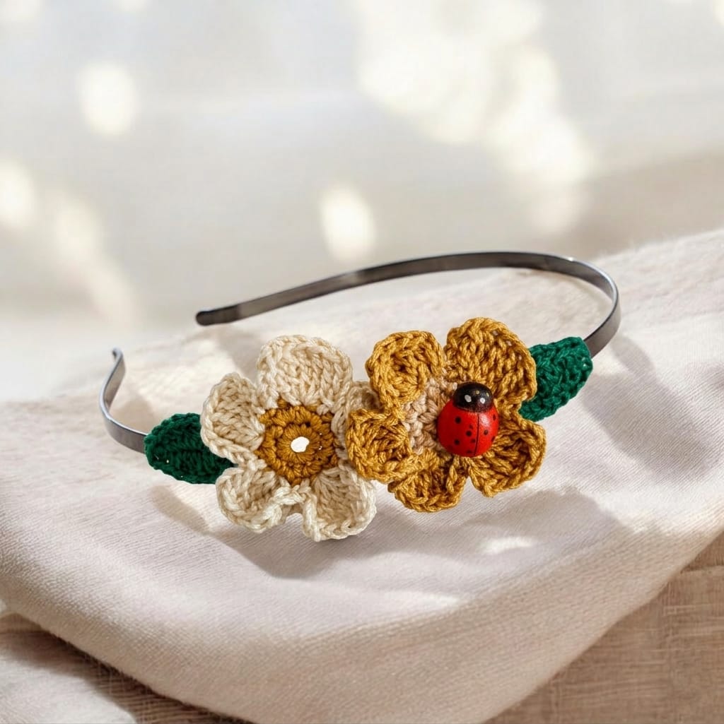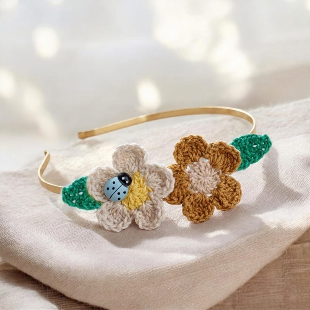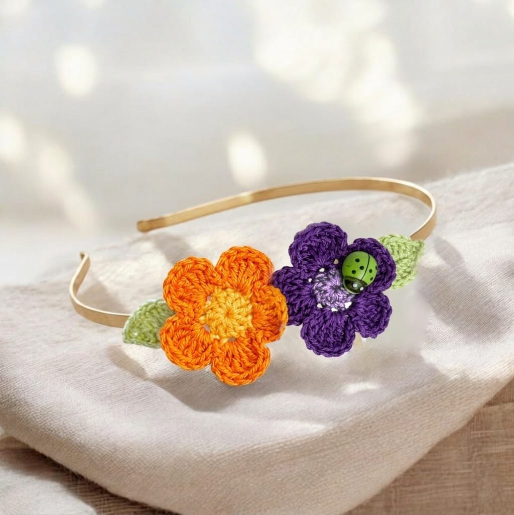 Bentiță de cap, cu bază metalică și decor floral croșetat manual – un accesoriu autentic și elegant, ideal pentru a adăuga originalitate oricărei ținute.