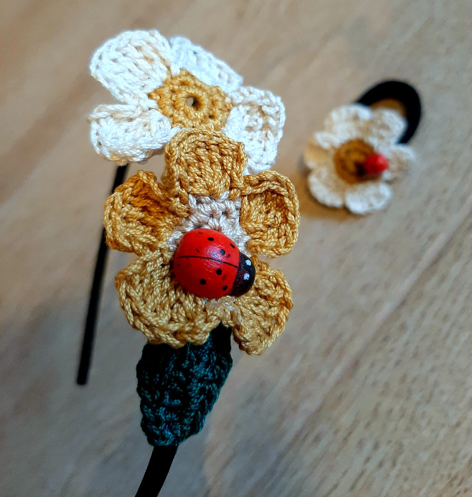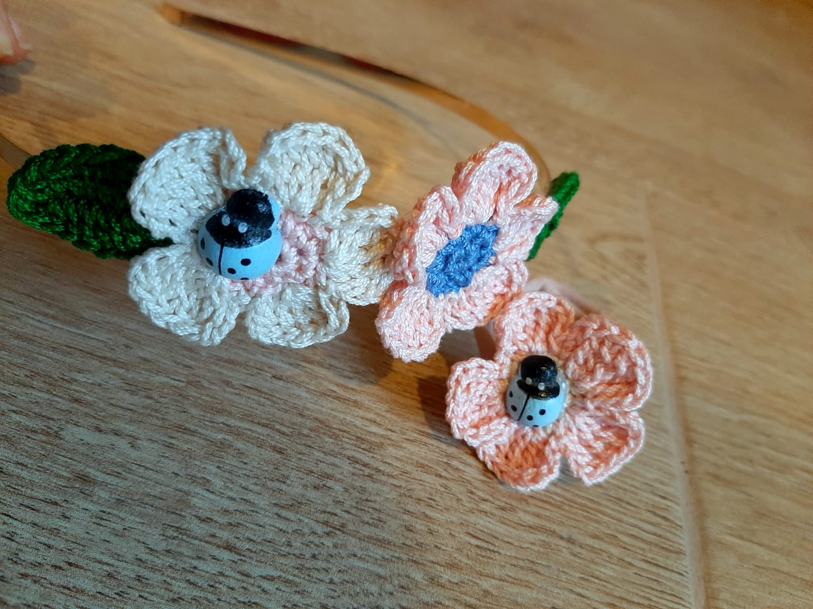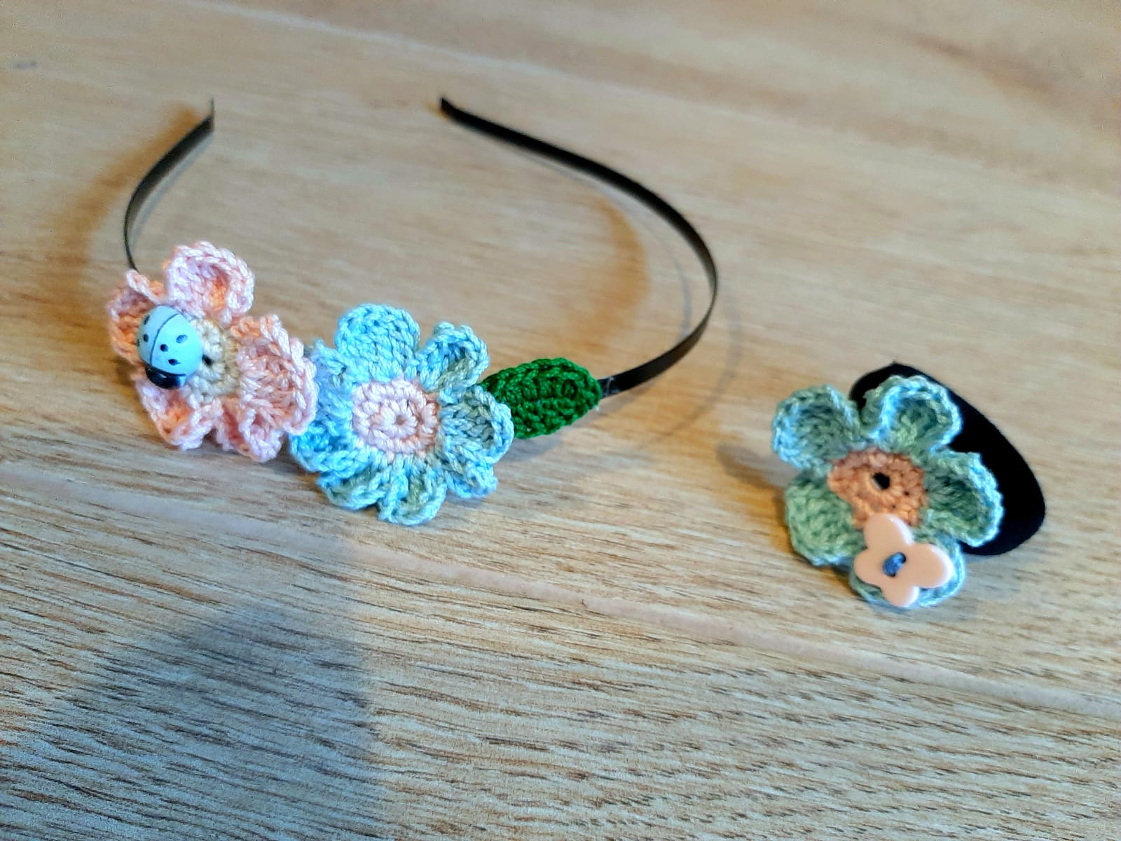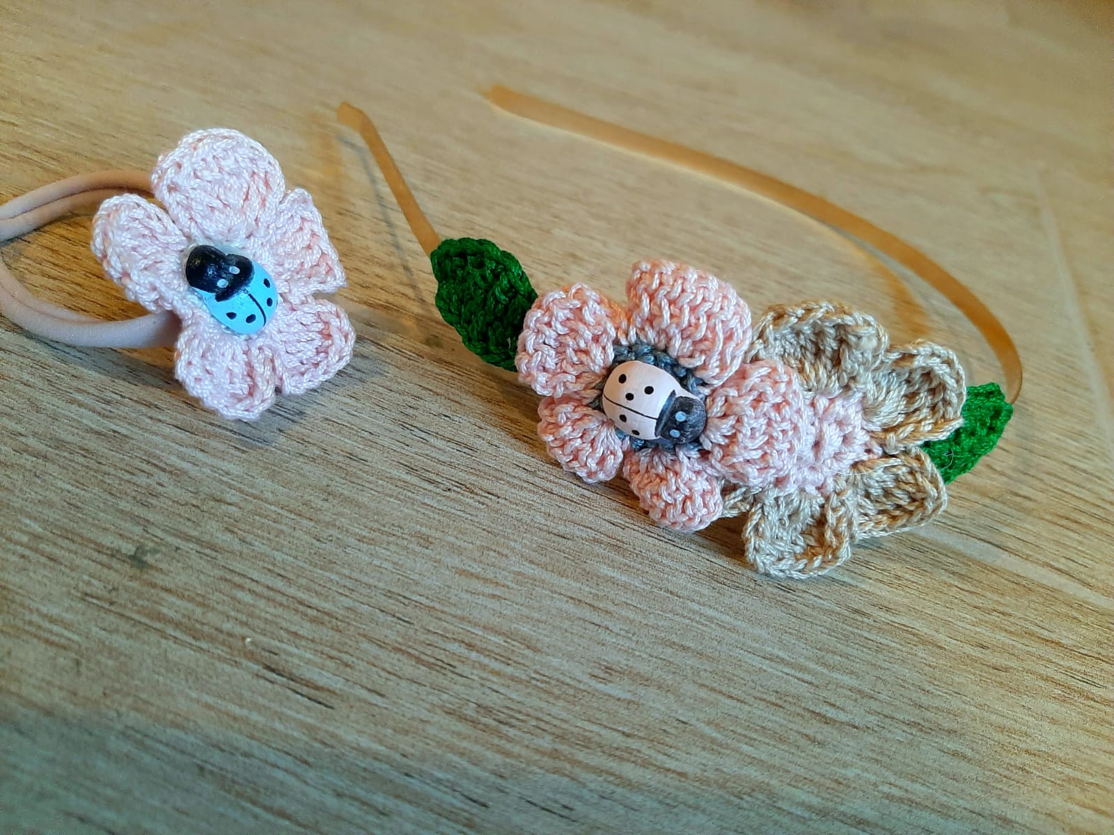 Bentiță de cap, cu bază metalică și decor floral croșetat manual – un accesoriu autentic și elegant, ideal pentru a adăuga originalitate oricărei ținute.
